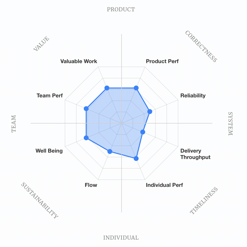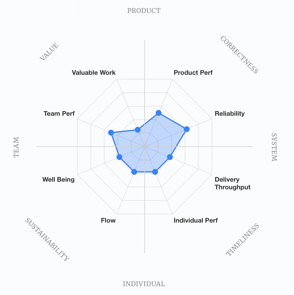 In a radar chart, our brains are hardwired to interpret “more area” as “more value” or “better.” But in the current DORA charts, some axes are “Good” (Deployment Frequency), and some are “Bad” (Burnout, Friction).
