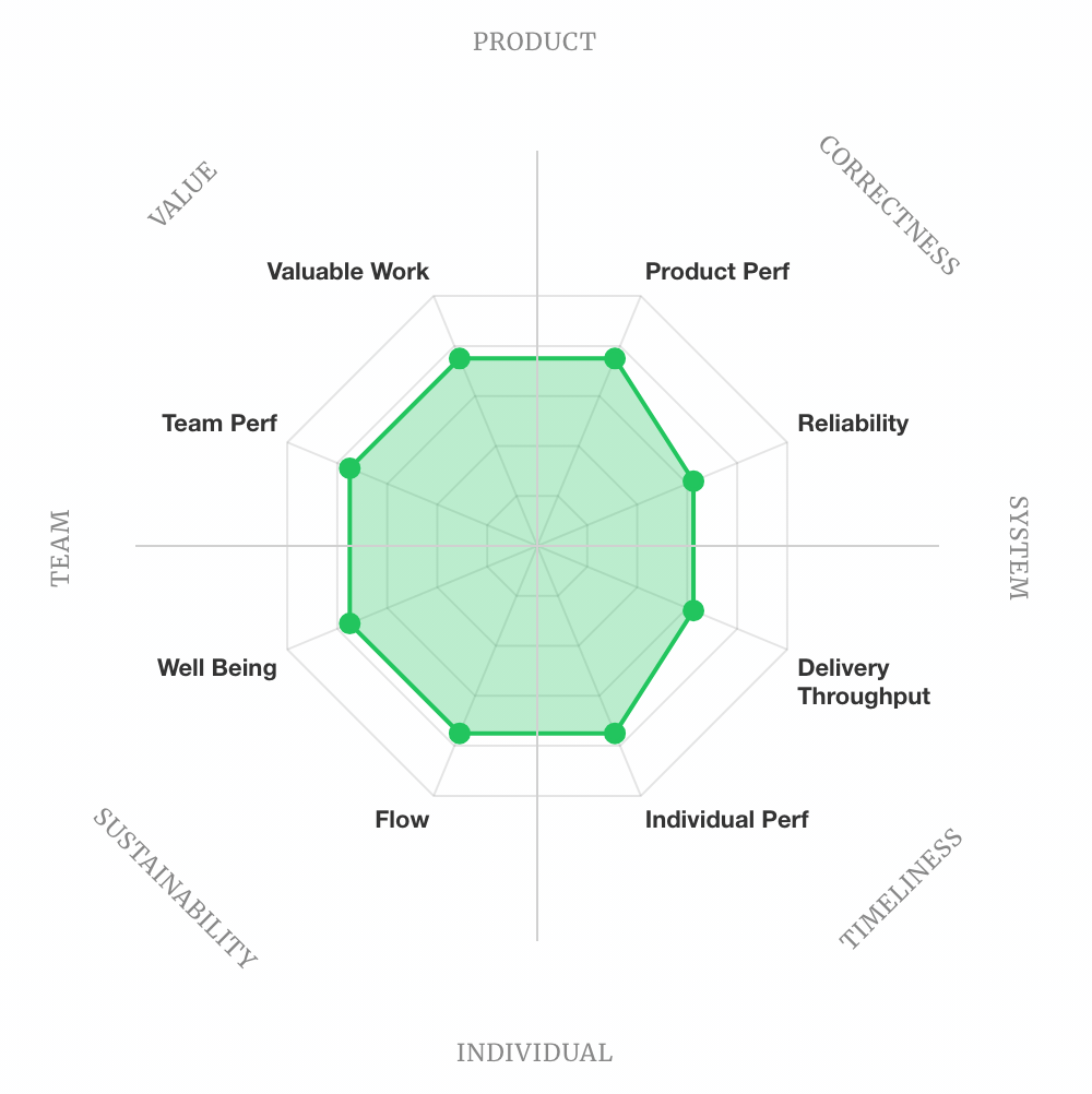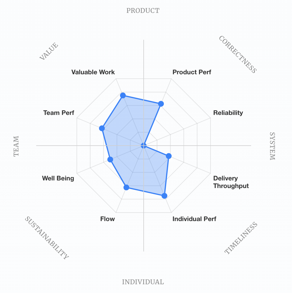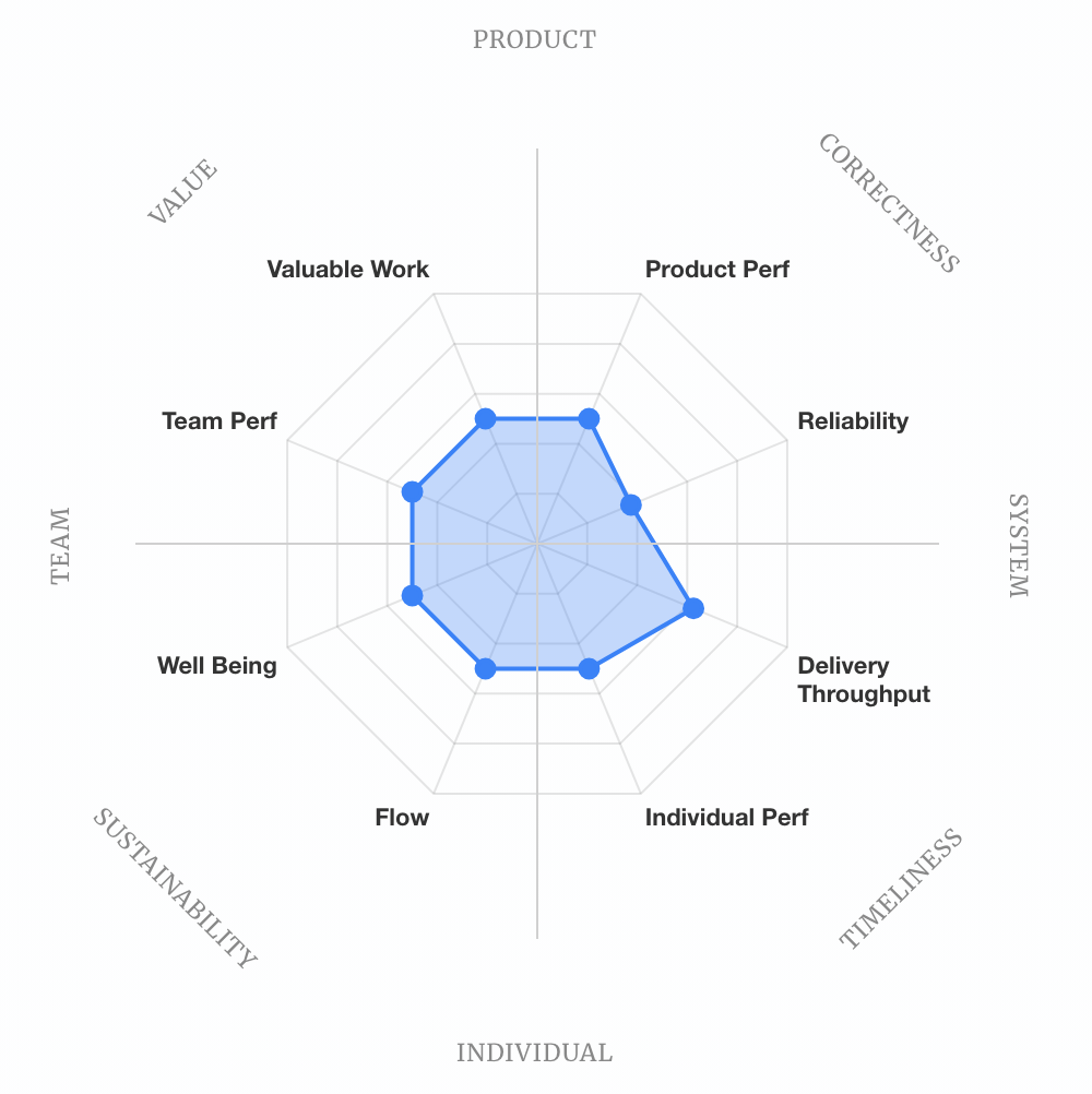 The South-East axes (Delivery Throughput and Individual Performance) answer the question: Are we building it fast?