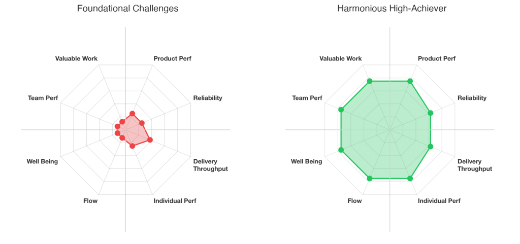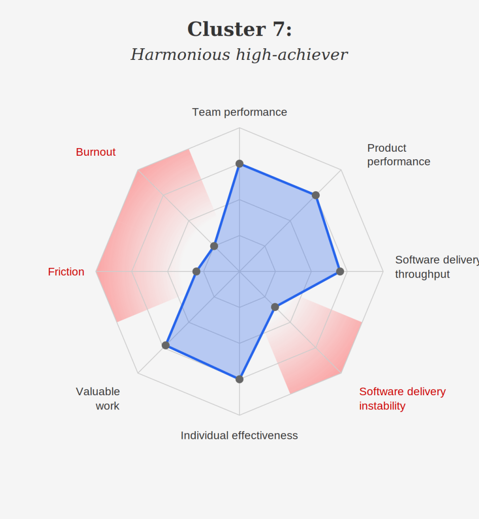 If we zoom in on the “Harmonious high-achiever” chart, we can see that low values for Burnout, Friction and Software Delivery Instability show a desirable narrowing. Contrast this with “Foundational Challenges,” which might appear to have a similar volume of area but represents a totally different (and worse) reality. This confusion is reinforced when a glance suggests that “High impact, low cadence” has the largest volume, so is this the highest-performing cluster?