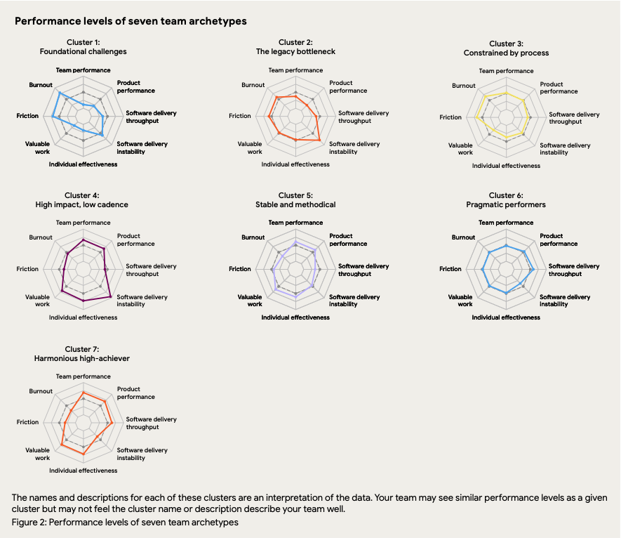 Below are the seven team archetypes and their performance levels across the eight axes: